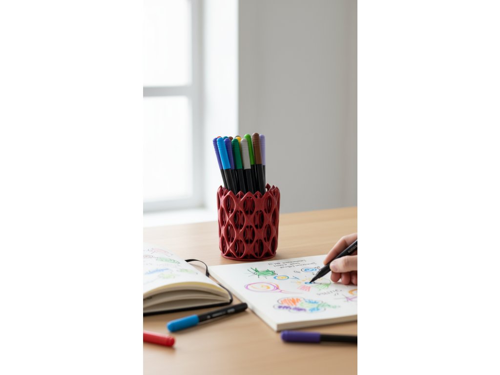Designový stojánek na tužky a psací potřeby je vytvořen metodou 3D tisku a nabízí nejen funkčnost, ale i jedinečný vzhled. S jeho důmyslným vzorem vypadá elegantně a zároveň umožňuje snadné skladování psacích potřeb. Ideální do kanceláře, na domácí stůl nebo jako originální dárek pro kreativní duše.